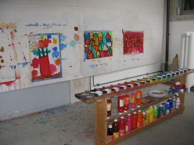 Im Malraum im Hinterhaus Kapellenweg 11 in Binningen, Nähe Zoo Dorenbach Basel. Es gibt einen zentralen Farbtisch, wo sich alle Malenden mit Pinsel und Farbe bedienen. Gemalt wird stehend an den Wänden. Bei Anwendung anderer Techniken richte ich den Raum dementsprechend ein.